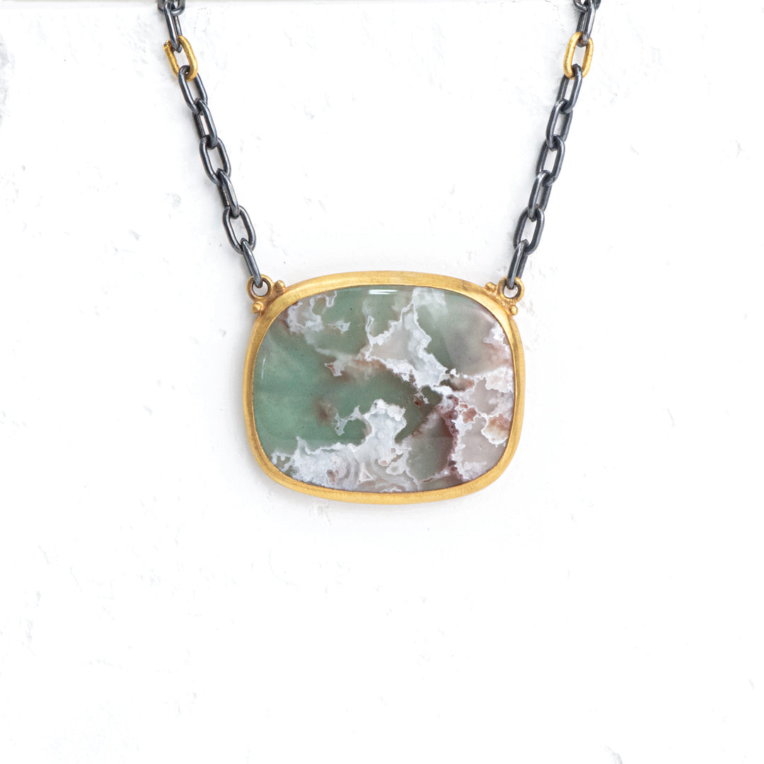 24K Yellow Gold and Oxidized Silver Aquaprase Cabochon "MY WORLD" Necklace