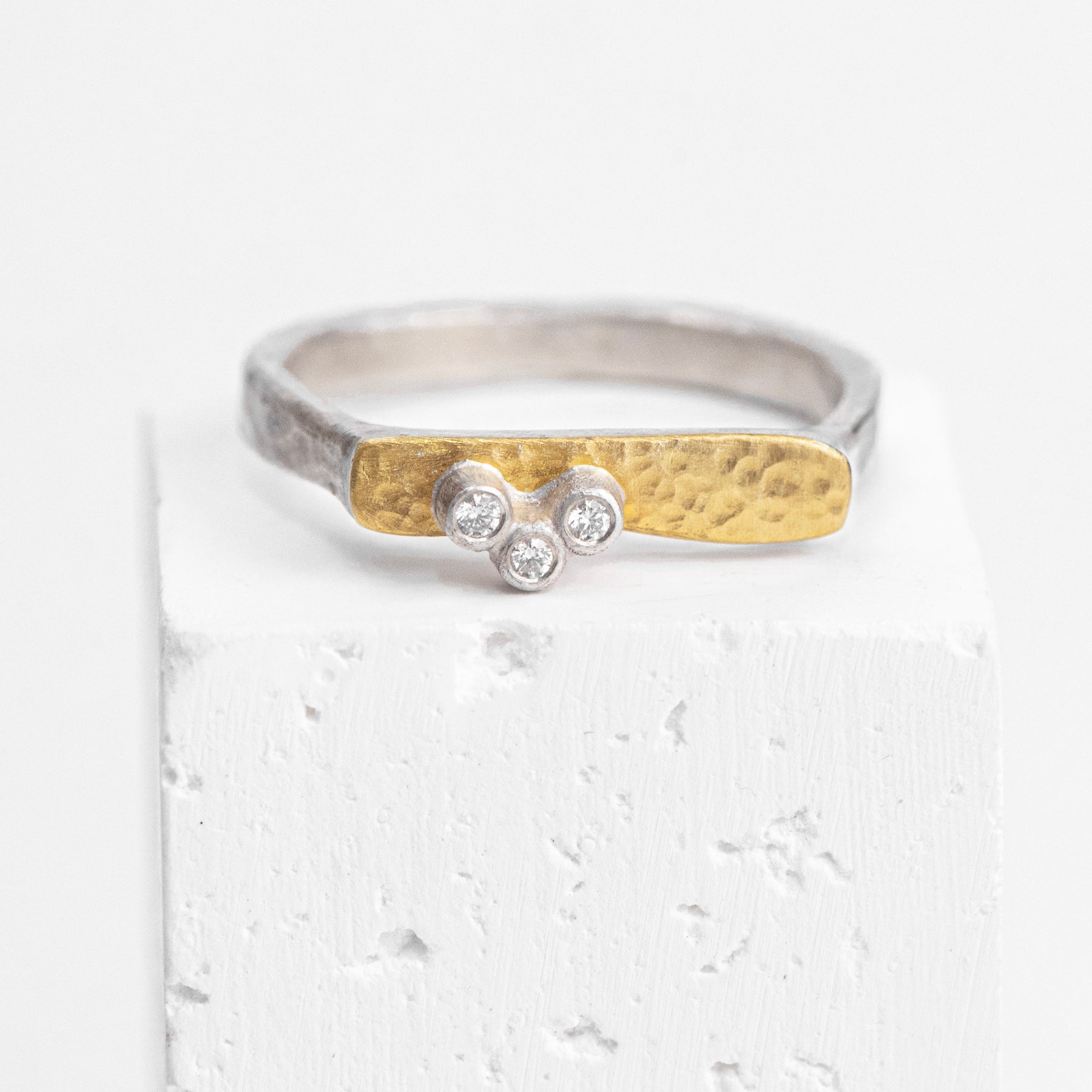 This Stockton ring combines sterling silver with a bar of 24K fusion gold across the top. Three round diamonds are set in small bezels, forming a clustered accent that softens the linear design. The lightly irregular band and mixed-metal surface give it texture and contrast. Slim in profile, it can be worn alone for a minimal statement or stacked with other bands.