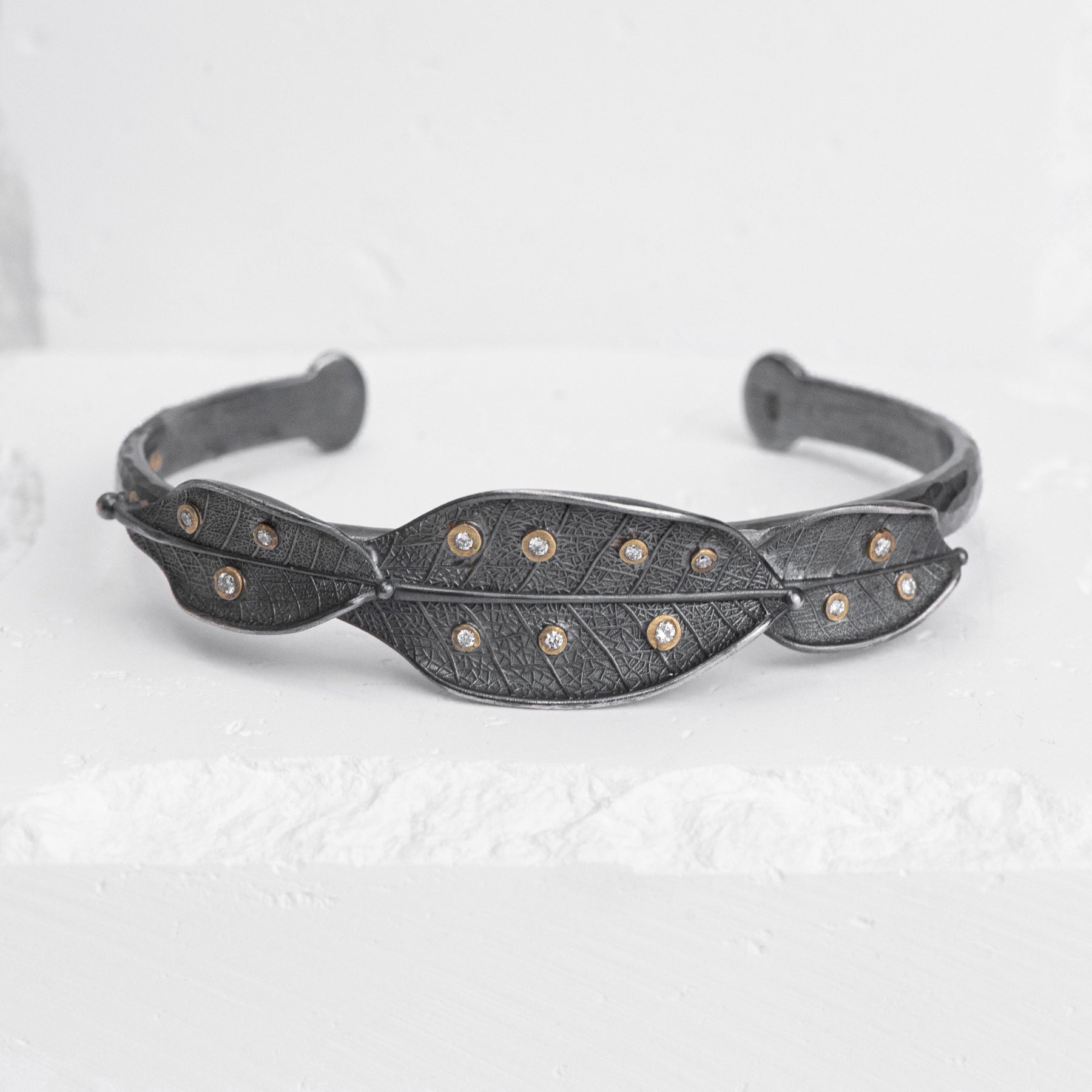 A cuff bracelet in oxidized sterling silver and 24K yellow gold with leaf-shaped panels set with round diamonds. The hand-finished texture brings out fine vein detail, while the scattered gold-rimmed stones add subtle light across the surface. The open form sits close to the wrist with a natural curve. Best suited for someone drawn to organic shapes with precise craftsmanship.