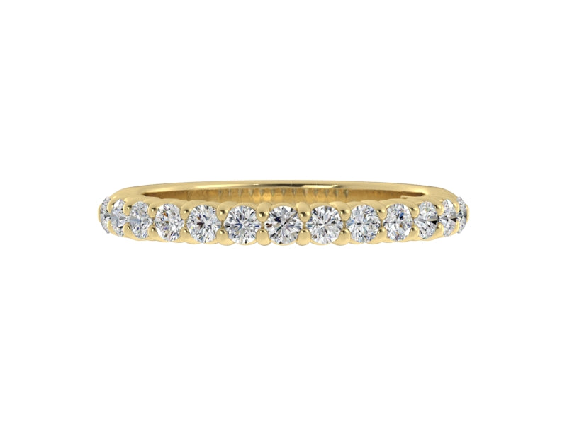 This message only appears in theme editor.This 14K yellow gold band features 13 natural earth-mined diamonds, totaling 0.5 carats, in a shared prong setting. Adorn your finger with elegance and luxury with these G-I color and VS-SI1 clarity diamonds. Complete your jewelry collection or celebrate your special moments with this anniversary ring.