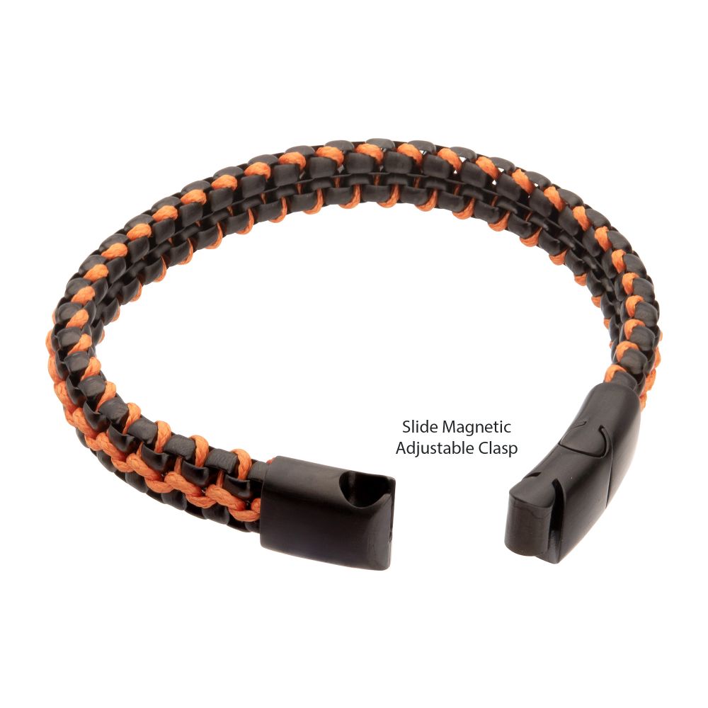 7.75-8.25" Matte Black Finish Stainless Steel Bracelet with Orange leather cord- engravable