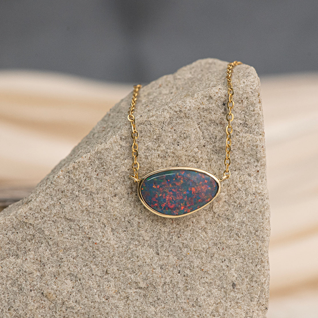 This one-of-a-kind station necklace features a 1.68ct freeform opal doublet bezel-set in rich 14K yellow gold. The opal glows with vivid flashes of red, orange, and electric blue that shift in the light, giving it a dynamic, fiery appeal. Attached to a 16–18 inch adjustable cable chain, it’s a striking choice for those drawn to color, contrast, and clean design.