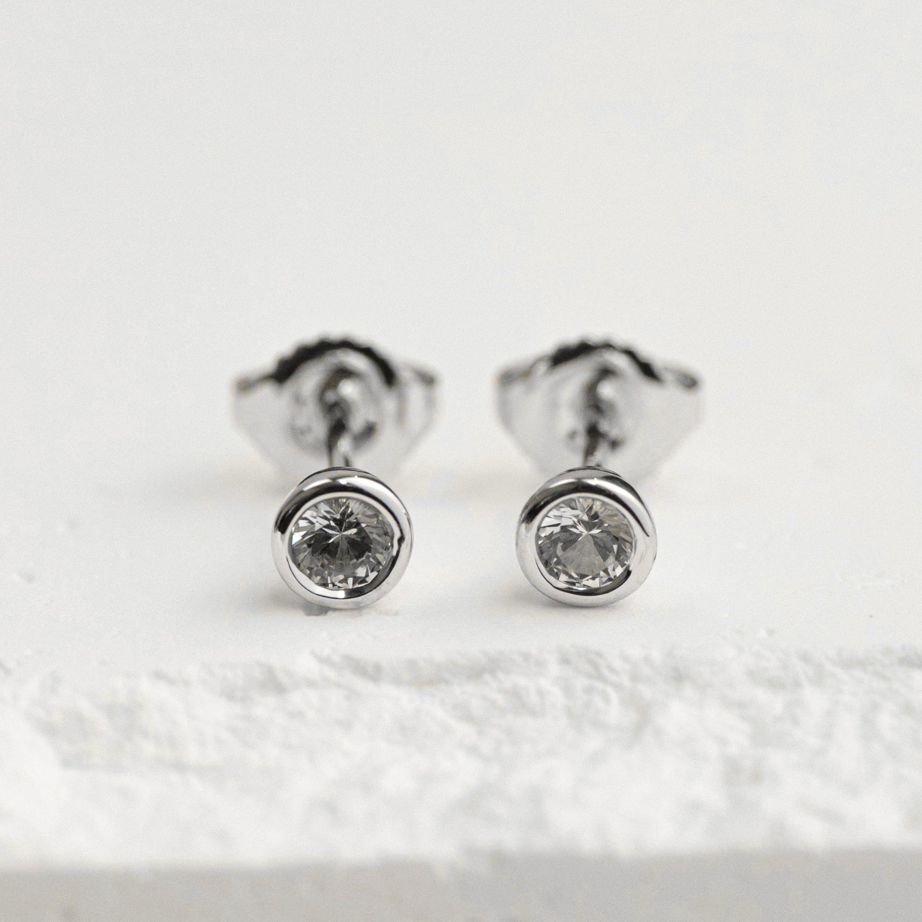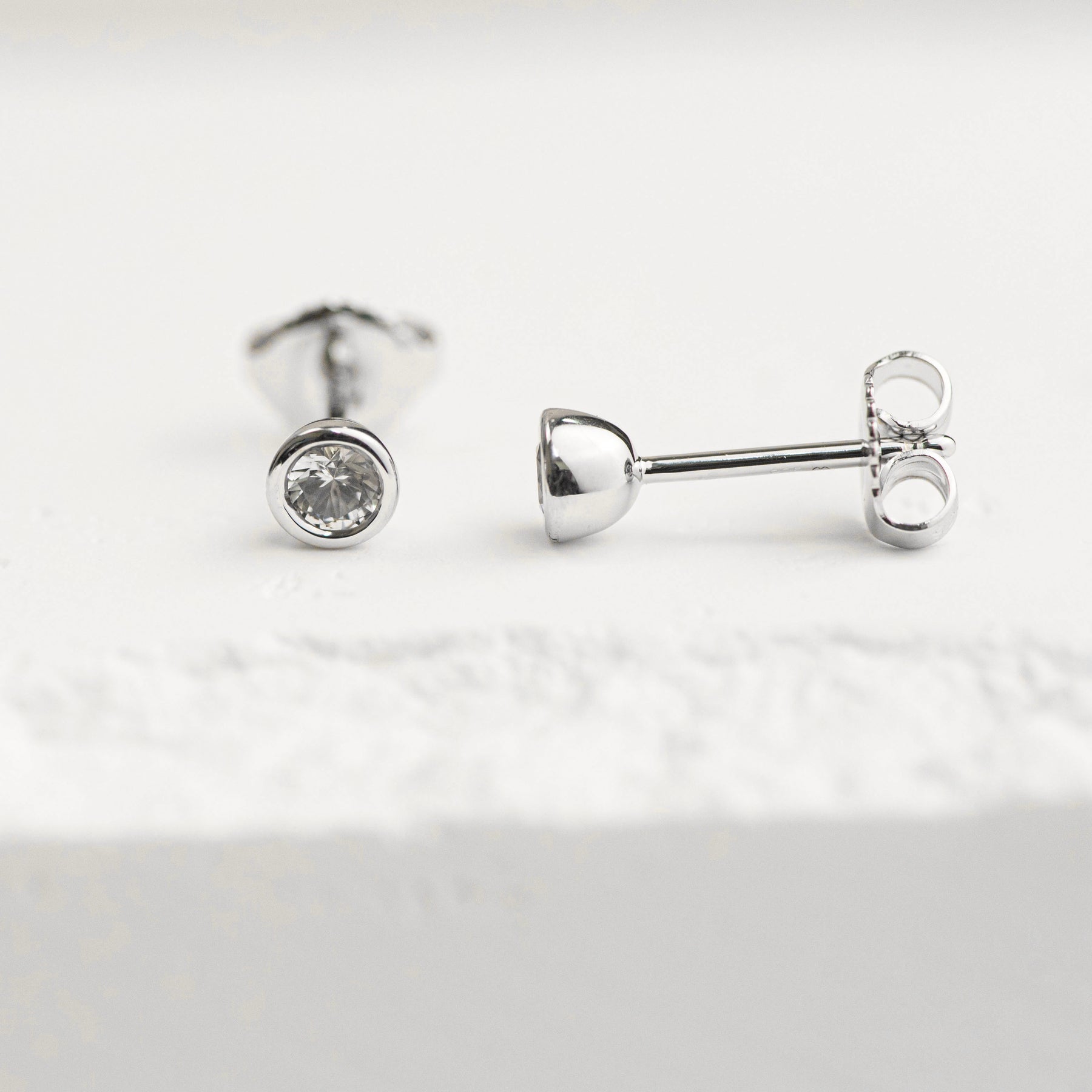 These sterling silver stud earrings feature 3.5mm round lab-created white sapphires in smooth bezel settings. Lab-grown for clarity and brilliance, these stones offer the same durability and sparkle as natural sapphire with a bright, clear appearance. The minimal design makes them a versatile choice for both everyday wear and special occasions.