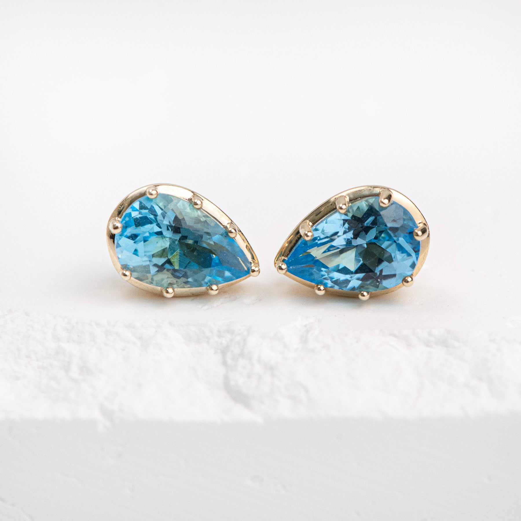 These blue topaz studs from Parlé are shaped in a classic pear cut, with crisp facets and a vivid sky-blue tone. Set in 14K yellow gold, each 9x6mm stone is prong-set to show depth and sparkle from every angle. The teardrop silhouette adds lift and length without feeling oversized. With a total weight of 5 carats, they’re eye-catching but structured. A good choice for someone who wants standout color in a stud that still feels refined.