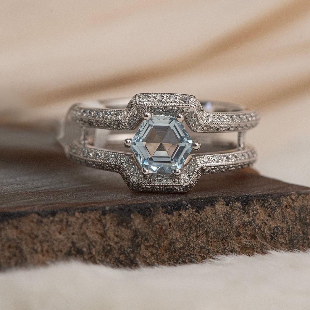 This 14K white gold ring features a 0.85ct hexagon-cut aquamarine in a clean prong setting. A diamond-lined double band with open negative space gives the design a bold, contemporary feel, while milgrain edges add a touch of vintage refinement. A distinctive choice for someone who loves statement rings with clean geometry and soft color.