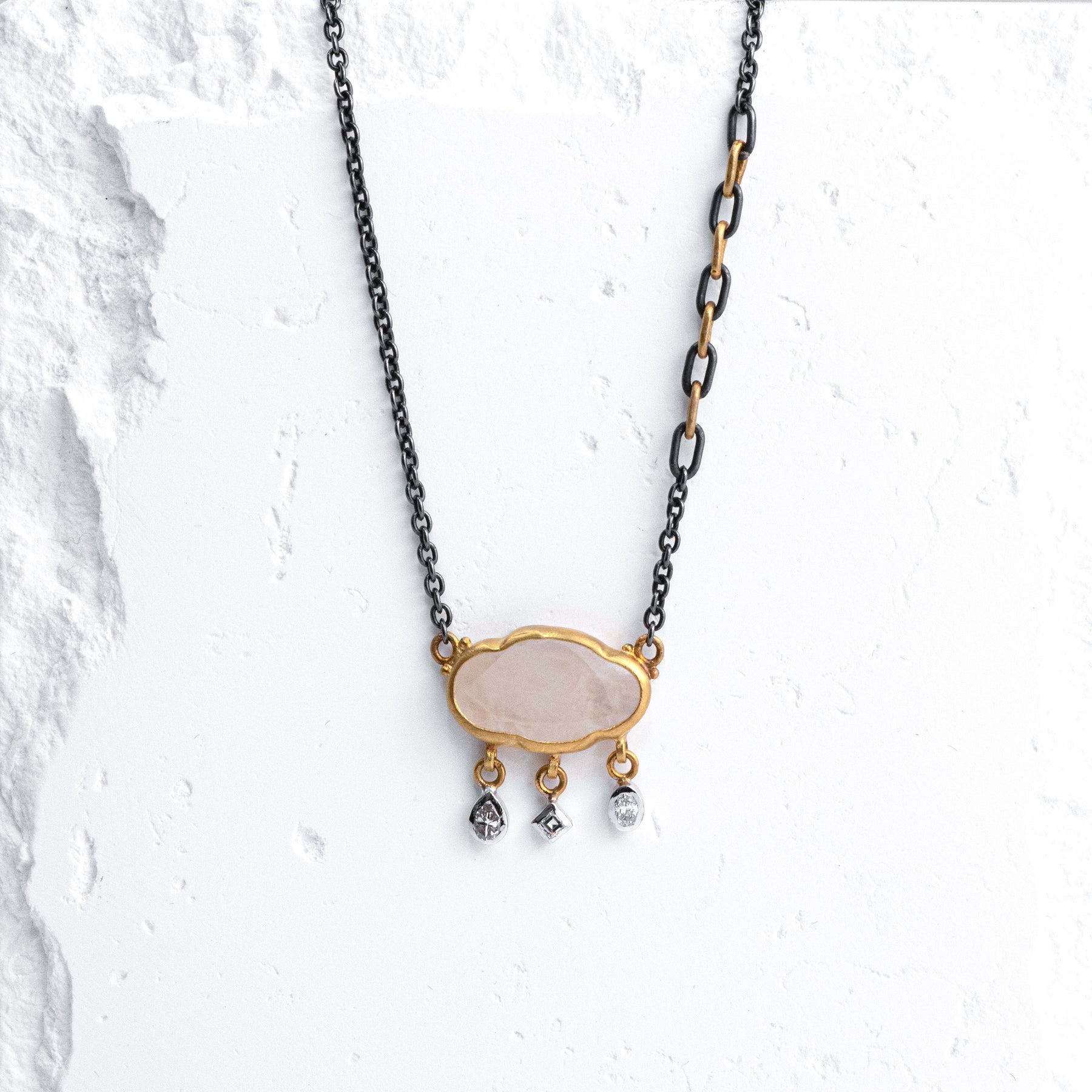 A cloud-shaped 11 x 16 mm moonstone cabochon is bezel-set in 24K gold and fixed to an oxidized silver cable chain with 24K gold accent links. Three diamonds, each set in 18K white gold and varied in shape, dangle below the form with light-catching movement. The necklace adjusts from 15 to 18 inches for adaptable wear. Made for someone who prefers expressive silhouettes and unexpected detail in everyday jewelry.