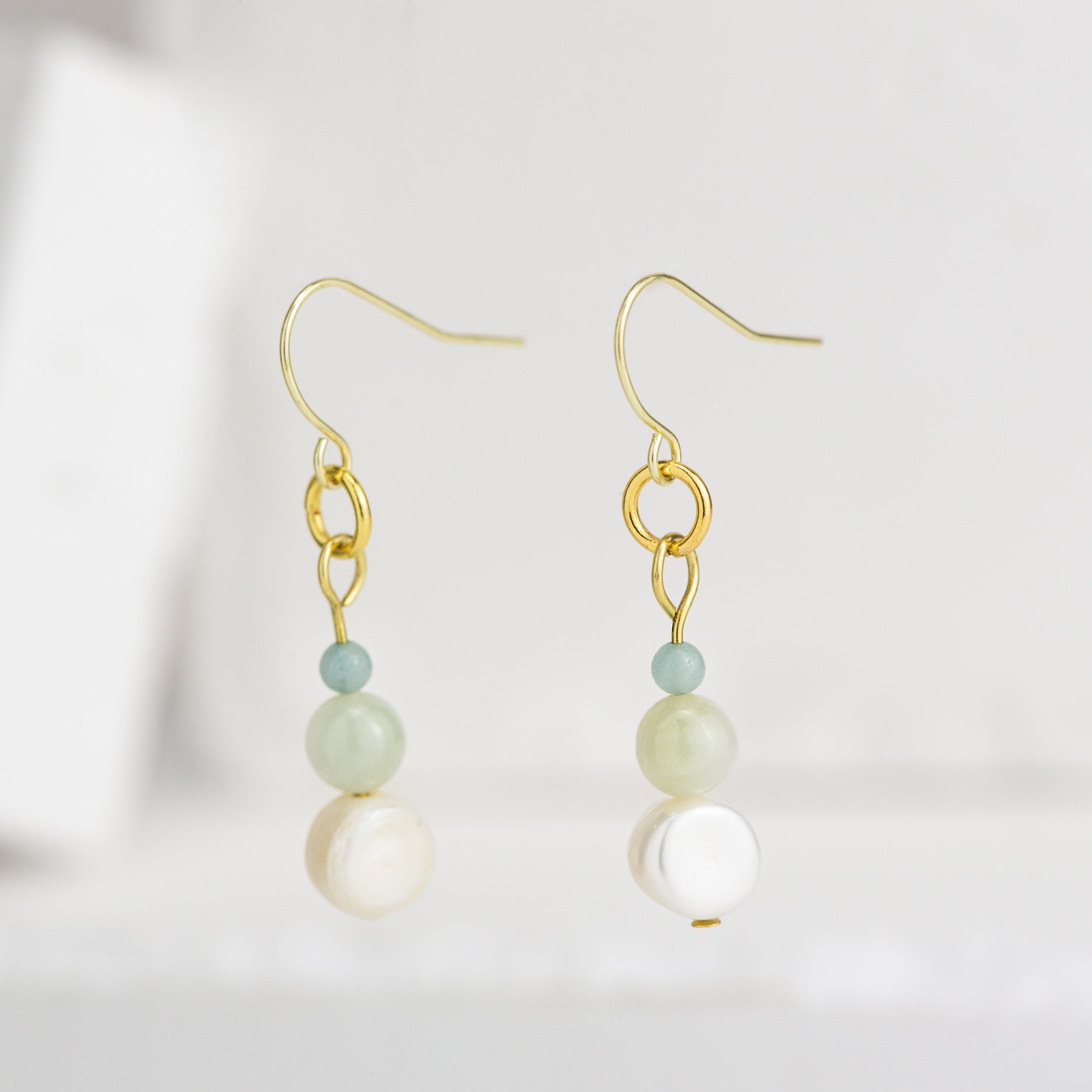 Single Pearl, Jade and Amazonite Drop Earring 14 Yellow Gold Plated