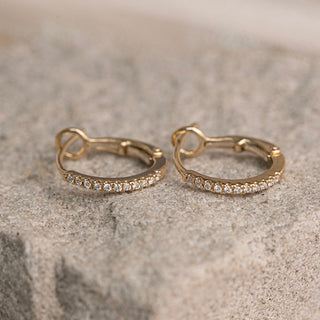 These 14K yellow gold huggie earrings feature a fine row of round diamonds totaling .06 carats, each held in a clean shared prong setting. The hinged design secures with a gentle latch for a smooth, comfortable fit. Their compact shape and warm finish make them a subtle staple for daily wear.