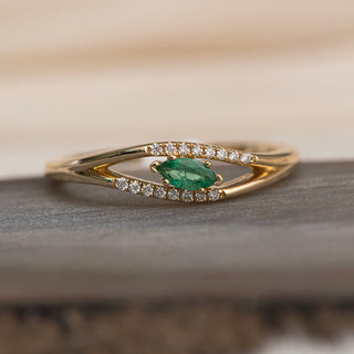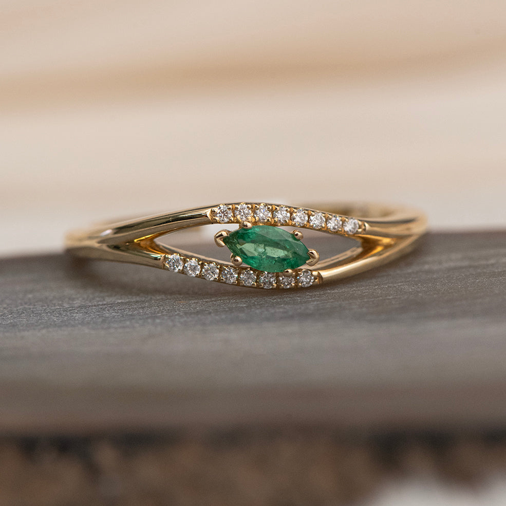 This elegant bypass ring features a vibrant .13ct marquise-cut emerald embraced by two graceful rows of .06ctw round diamonds. Set in warm 14K yellow gold, the open silhouette offers a delicate balance of modern design and timeless style. A beautiful choice for May birthdays, green lovers, or anyone who appreciates graceful detail in a sleek, stackable profile.