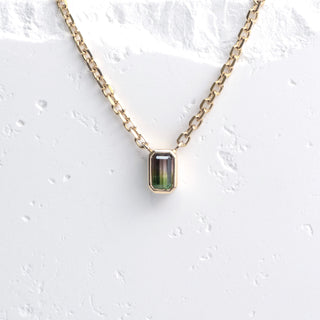 This Parlé necklace features a .93 carat emerald-cut watermelon tourmaline, showing natural green and pink zoning in a vertical layout. Framed in a smooth 14K yellow gold bezel, the bi-color tourmaline stands out for its earthy tone and unique pattern. The compact scale and clean lines make it easy to wear every day. A strong choice for anyone drawn to pink and green gemstones or looking for a colorful necklace with understated shape.