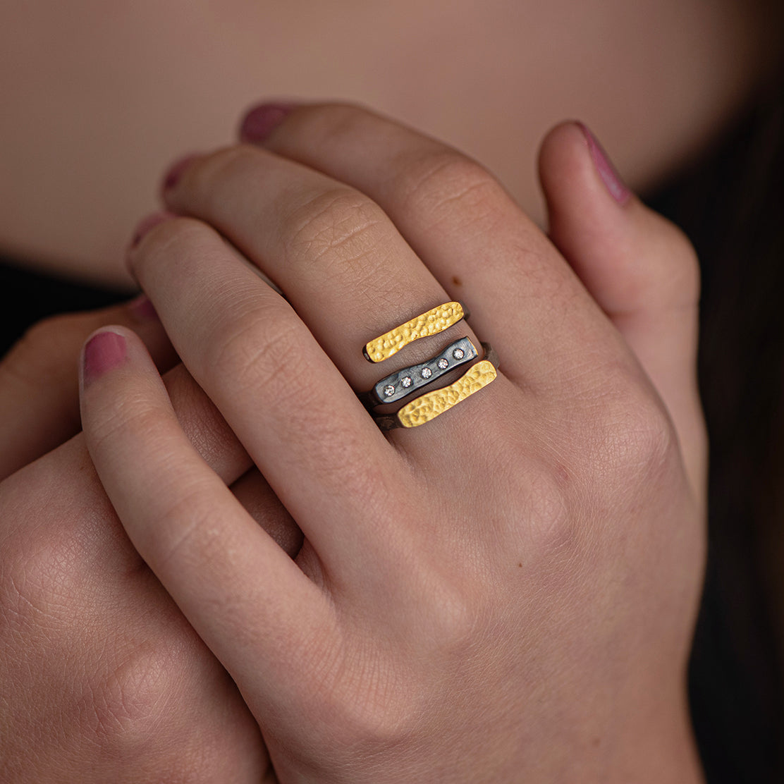 Two offset bars wrap into an open split silhouette, one in hammered 24K fusion gold and one in oxidized sterling silver set with a row of small flush diamonds. The contrast of warm gold, dark silver, and bright stones gives the ring a clean graphic look. Low and comfortable, it pairs easily with both gold and silver pieces for a mixed-metal look.