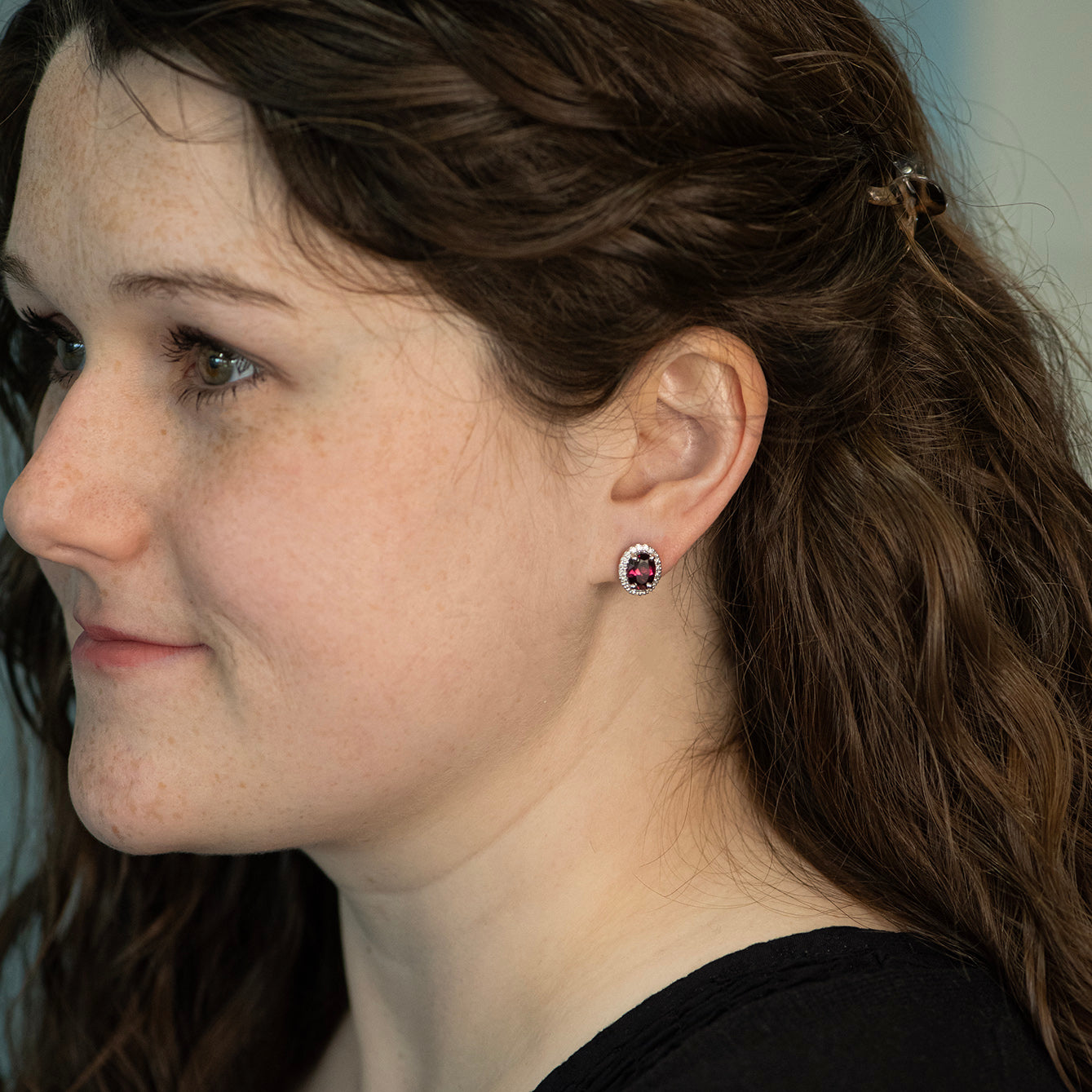 This exquisite pair of earrings boasts a captivating combination of rhodolite garnet and diamond stones, elegantly set in high-quality white gold. The halo design adds a touch of sophistication, making these earrings a stunning addition to any jewelry collection.