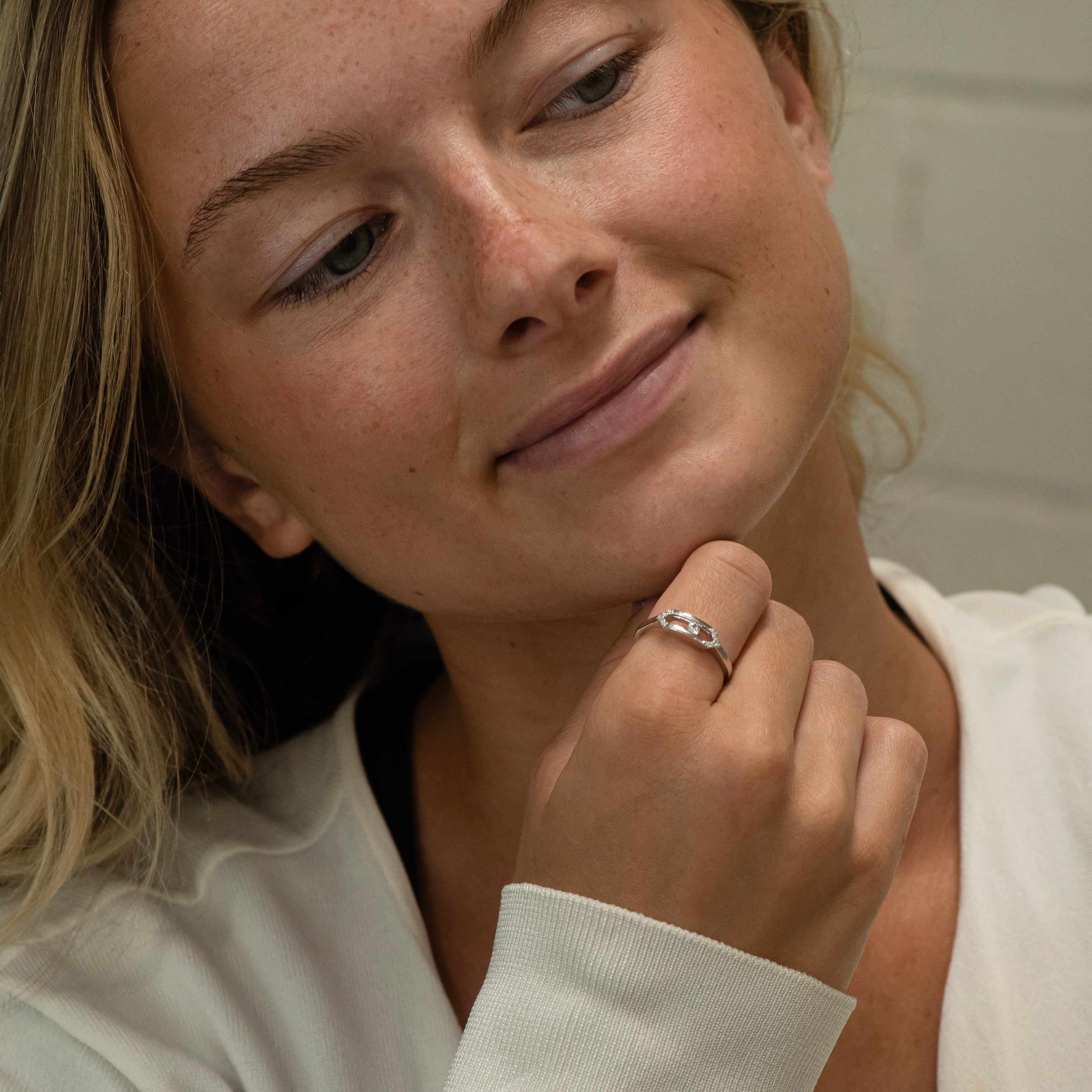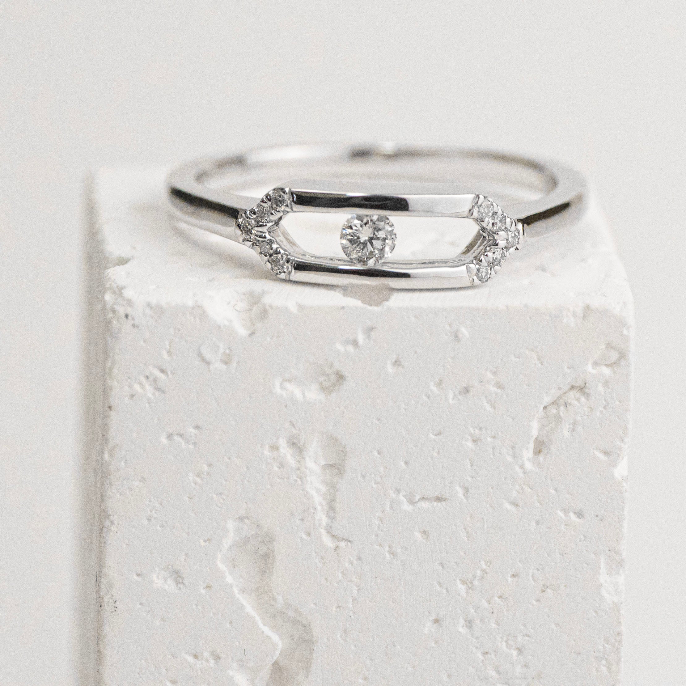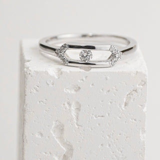 This sterling silver ring features a long hexagon frame accented with diamonds totaling 0.14 carats. At its center, a single round diamond slides freely along the open setting, creating movement and sparkle with every gesture. A modern, geometric design that feels both minimal and distinctive.
